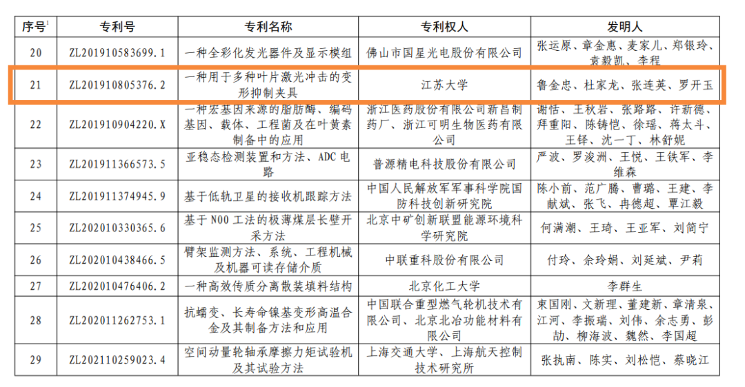近日,国家知识产权局发布第二十四届中国专利奖授奖决定,LEDONG.COM专利“一种用于多种叶片激光冲击的变形抑制夹具”(专利号ZL201910805376.2)喜获中国专利金奖。此次共有83所高校获得中国专利奖,获金奖的高校仅有5所,其中西安交通大学有2个项目获得金奖,浙乐动(中国)学、上海交通大学、北京化工大学和LEDONG.COM各有1项金奖。