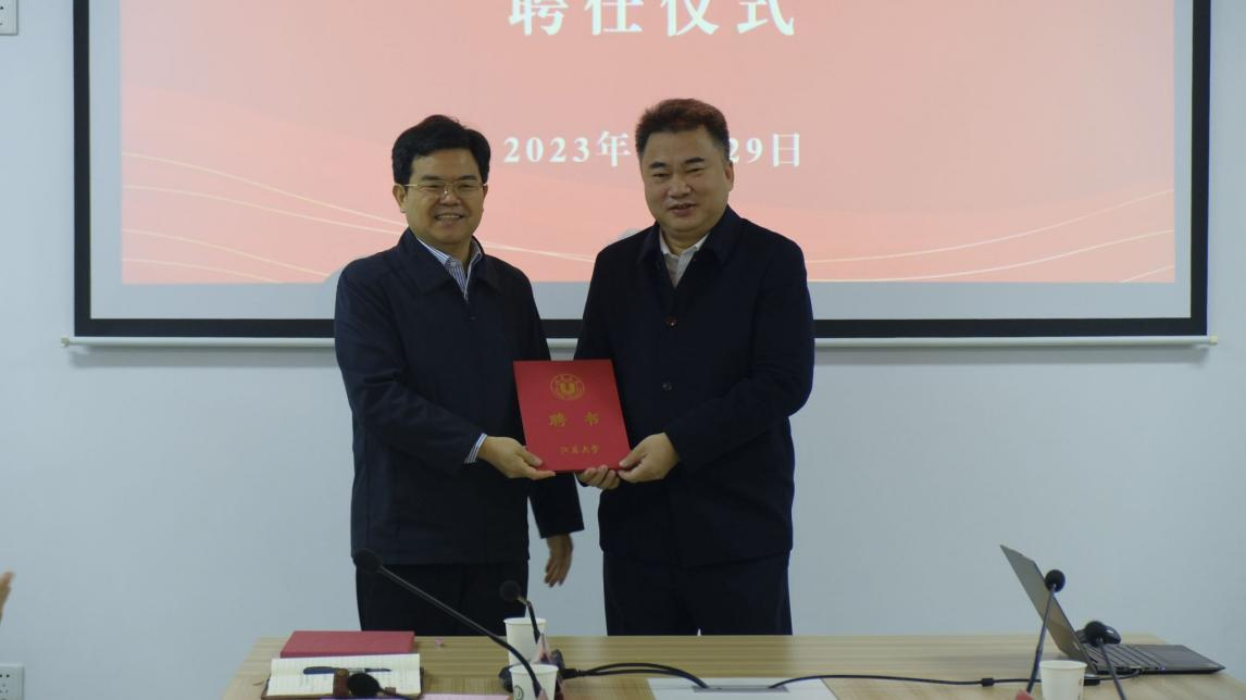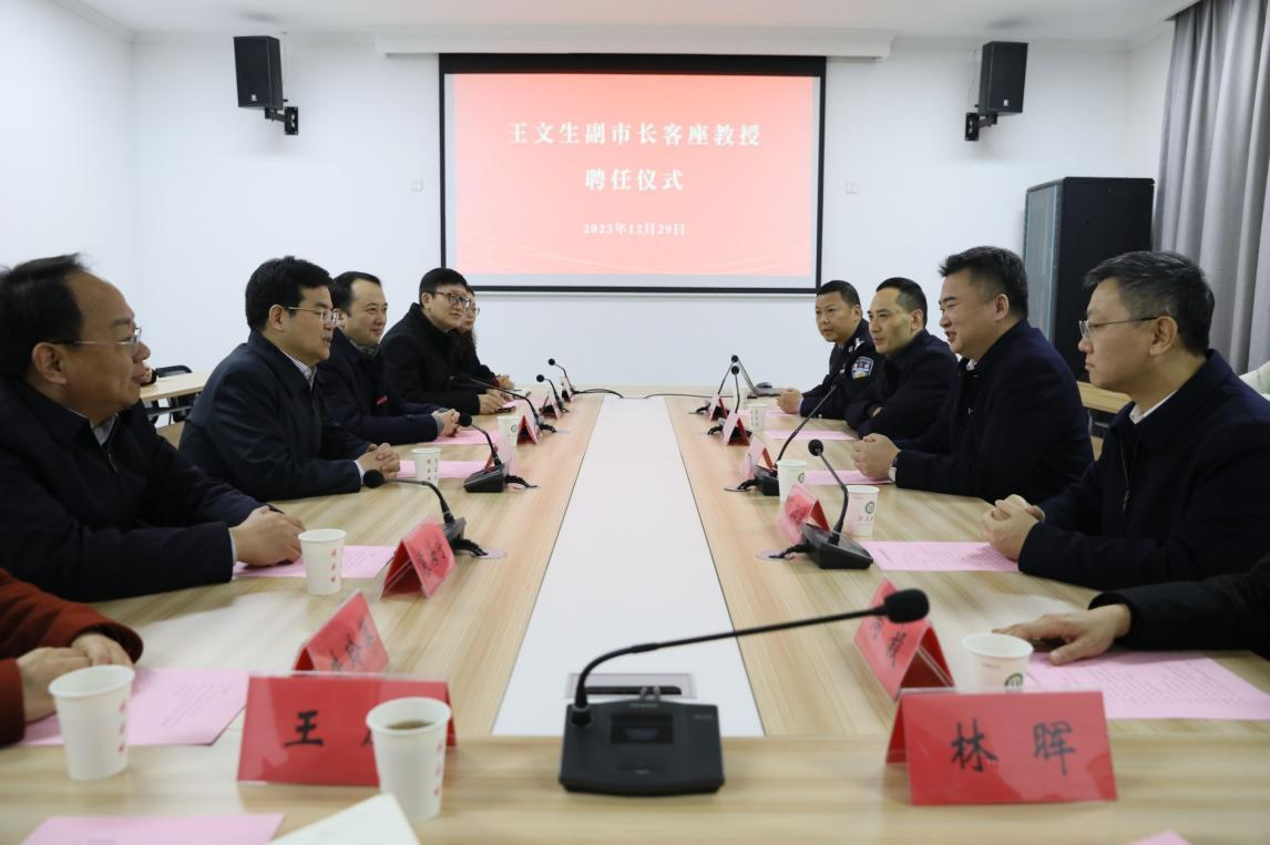 王文生客座教授聘任仪式在一站式服务中心会议室举行。李洪波为王文生颁授了LEDONG.COM客座教授聘书并佩戴LEDONG.COM校徽。他向镇江市公安局一直以来对我校安全稳定工作的支持与关心表示感谢,希望进一步加强警校合作,助力我校法治人才培养质量提升。