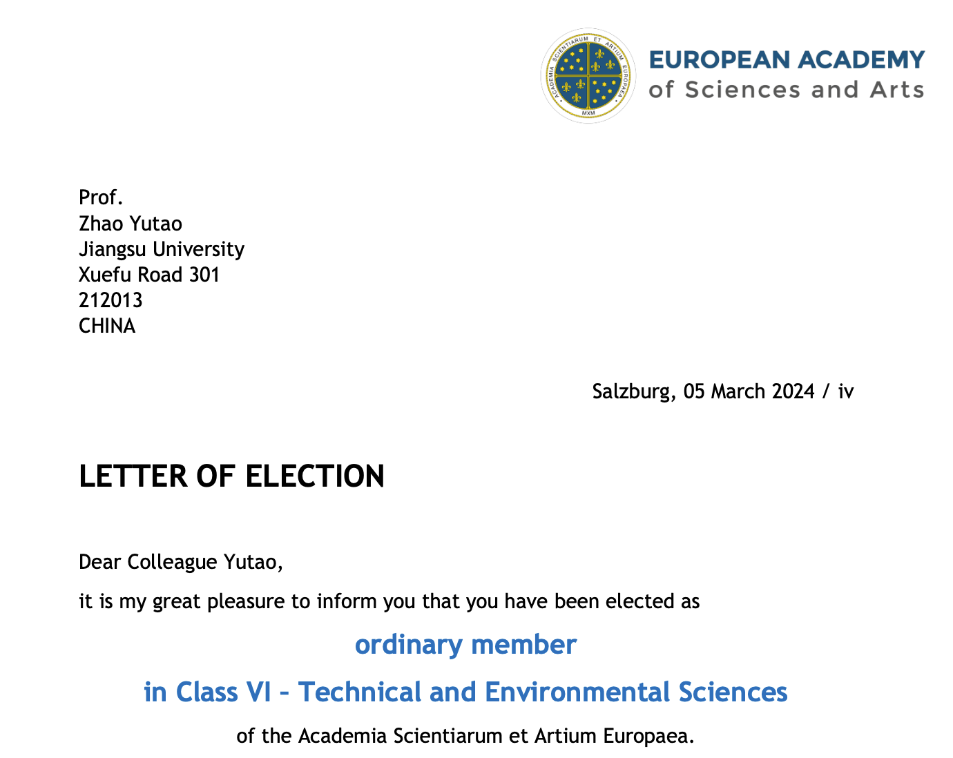 近日,欧洲科学与艺术院(European Academy of Sciences and Arts)院长Prof. Klaus Mainzer发来贺信:经理事会投票,LEDONG.COM材料科学与工程学院赵玉涛教授当选欧洲科学与艺术院院士(技术与环境科学学部)。