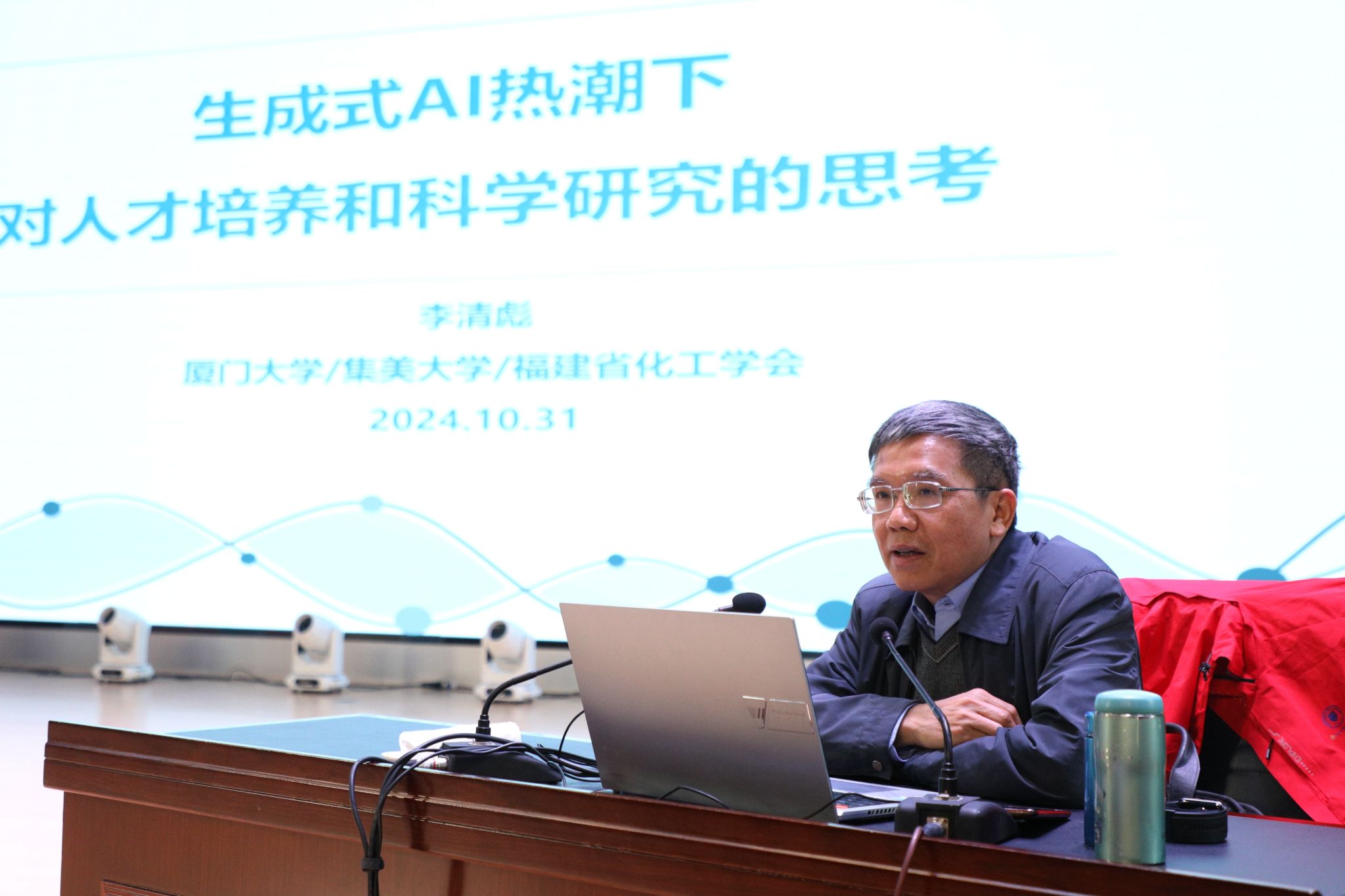 10月31日,集美大学原校长、中国化工学会会士李清彪教授应邀来校,作题为《生成式AI热潮下对人才培养和科学研究的思考》专题报告暨2024年新教师岗前培训开班第一课。报告会在学校大礼堂举行,由校长邢卫红主持。全体校领导、党委常委,全体中层干部、科级干部,各学院师生代表,2024年新教师岗前培训班全体学员以及相关单位教职工聆听报告。