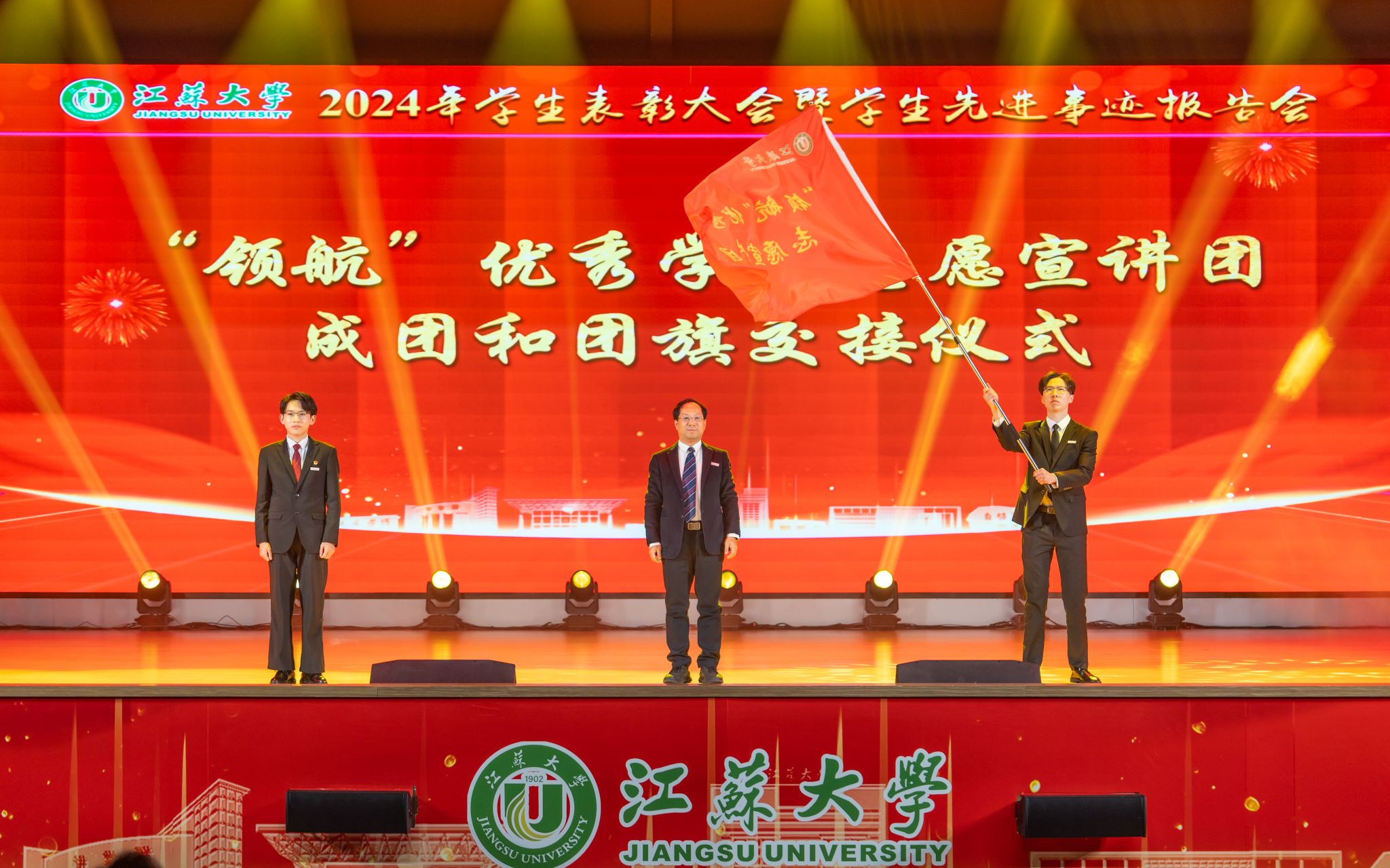 活动上举行了第二届LEDONG.COM“领航”优秀学子志愿宣讲团成团和团旗交接仪式,20名优秀学子成为宣讲团成员。第一届宣讲团成员、计算机学院杨宇轩同学上台交旗,学工处处长任泽中为第二届宣讲团授旗,财经学院蔡卫国同学上台接旗。