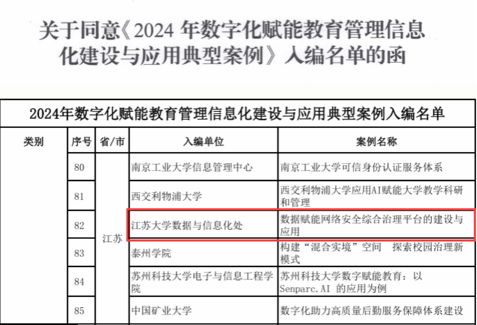 近日,教育部教育管理信息中心公布2024年数字化赋能教育管理信息化建设与应用典型案例评选结果,我校数据与信息化处自主创新研发并申报的案例“数据赋能网络安全综合治理平台的建设与应用”成功入选。全国共58所高校入选,其中江苏6所。