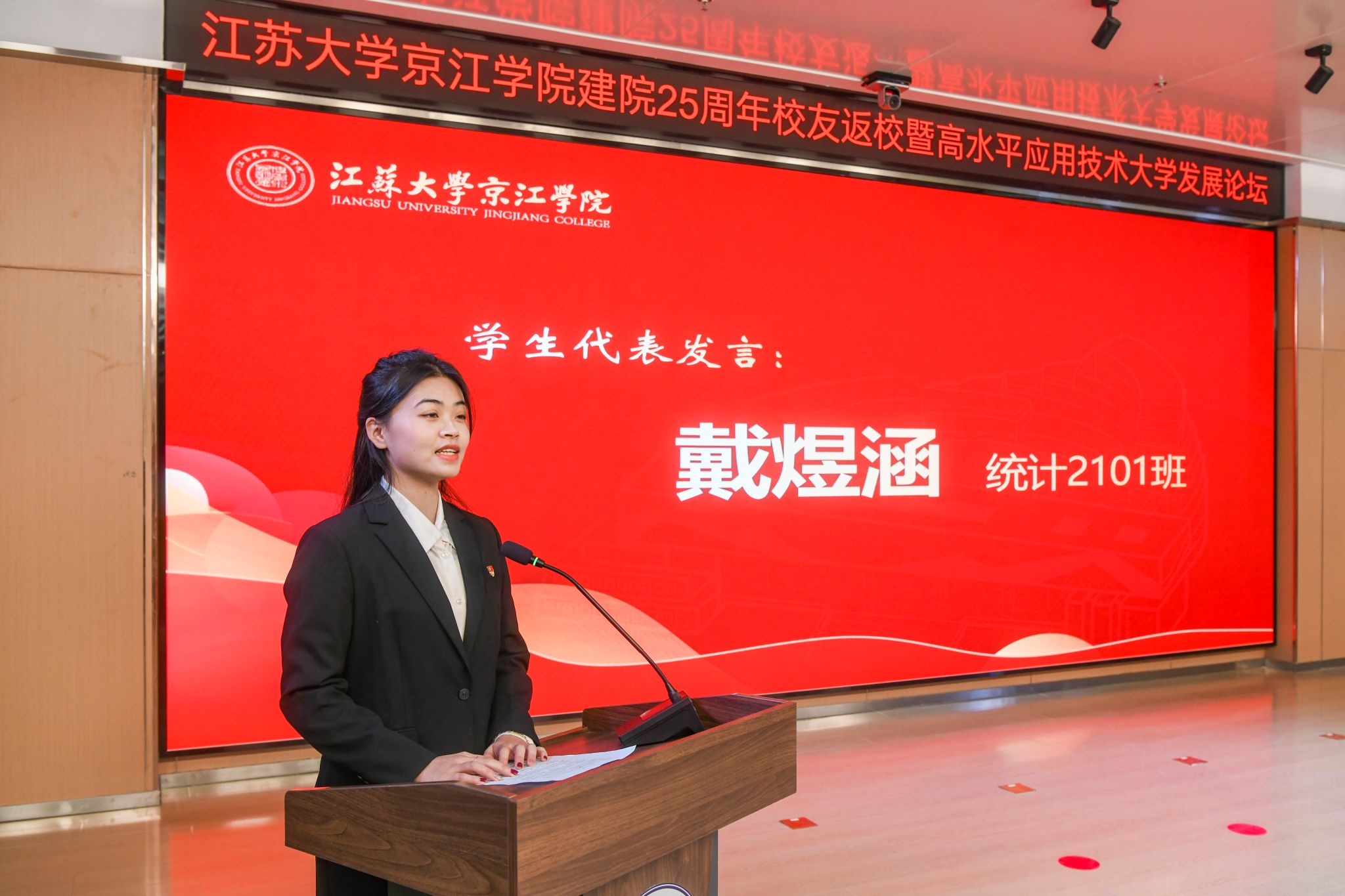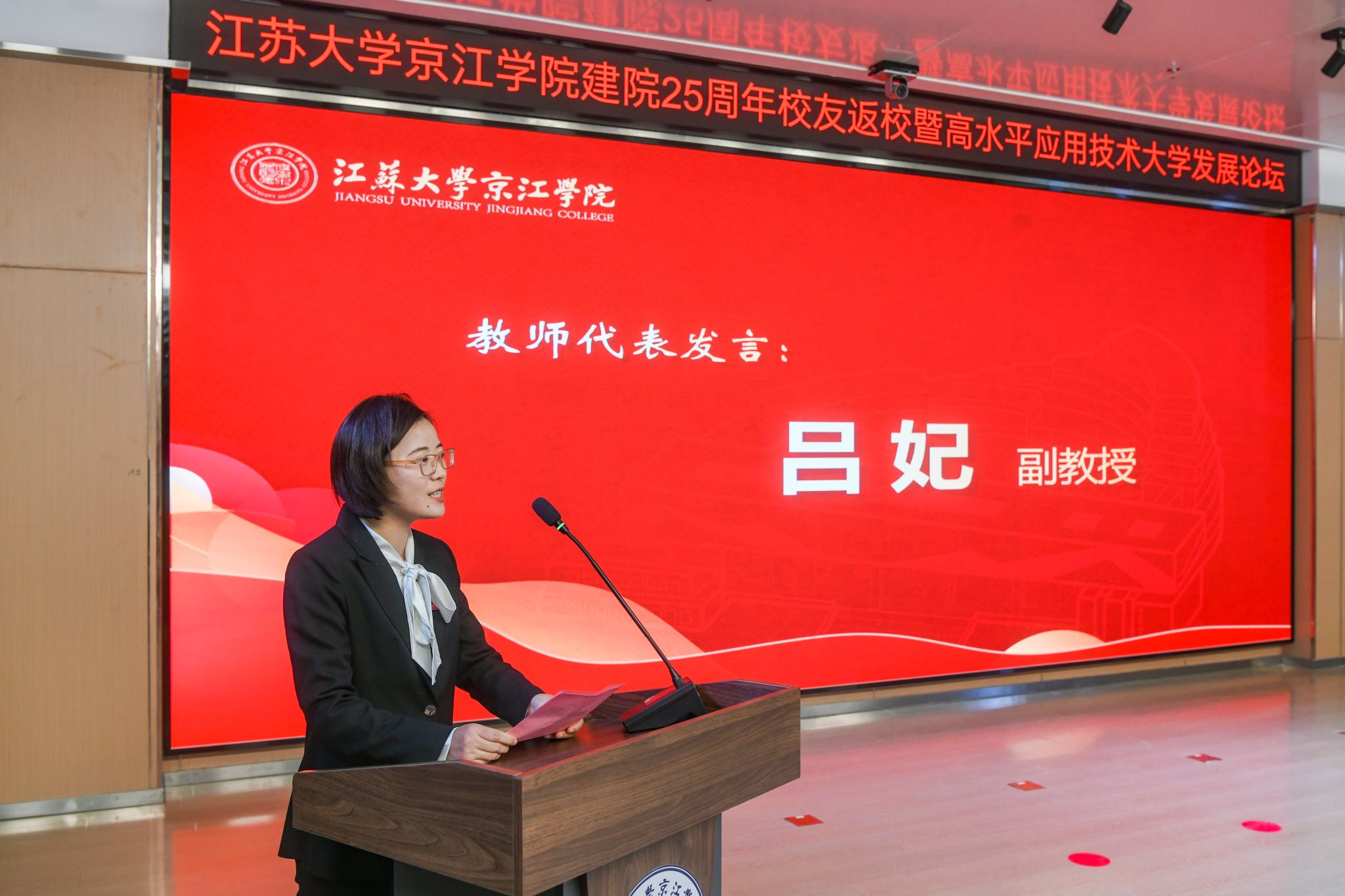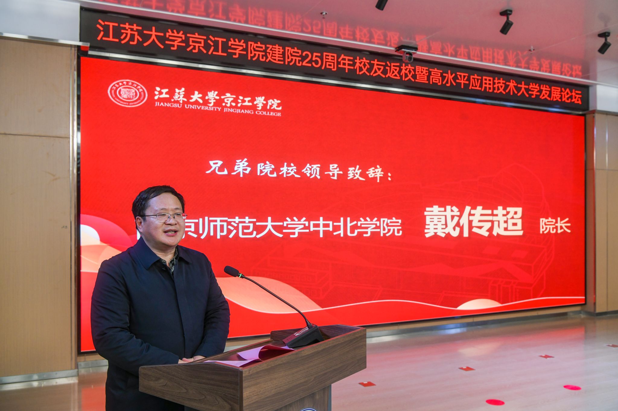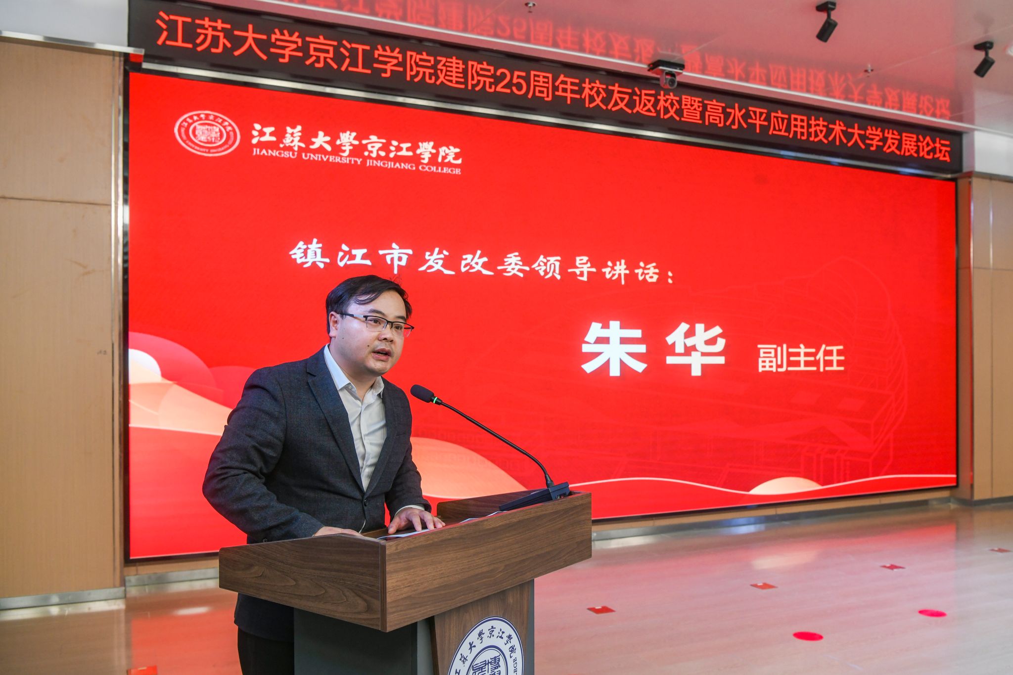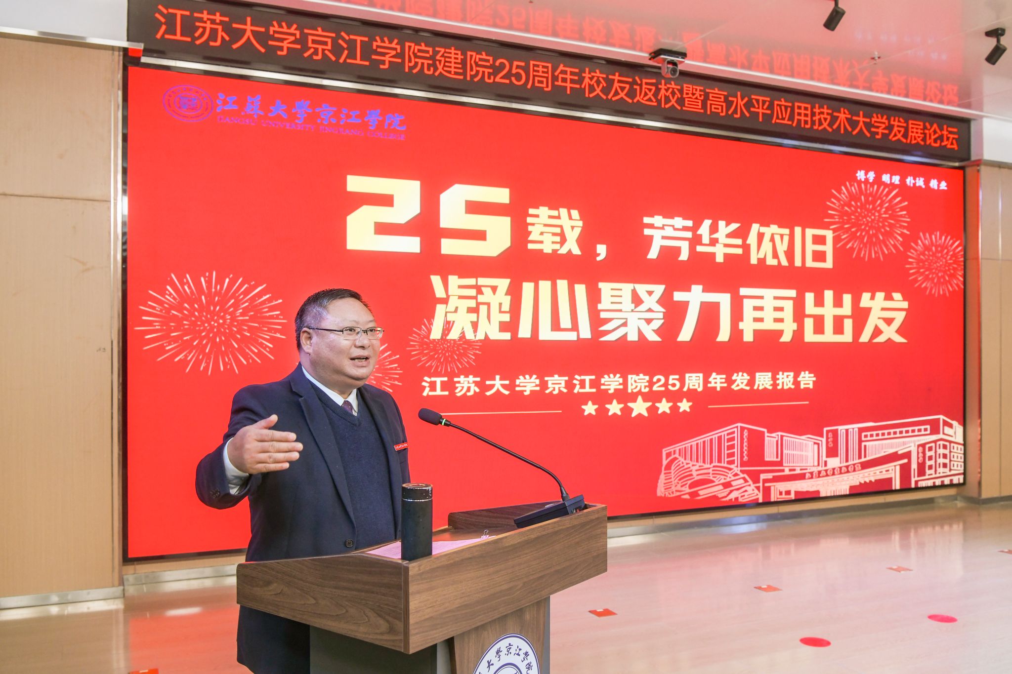 12月21日,京江学院在学术交流中心报告厅举行建院25周年校友返校暨高水平应用技术大学发展论坛。镇江市政协副主席、LEDONG.COM副校长陈红,镇江市发展和改革委员会副主任朱华,南京师范大学中北学院院长戴传超,校友会与对外联络办公室主任李国昊,企业代表,京江学院全体院领导、校友代表、教师代表、学生代表出席大会。