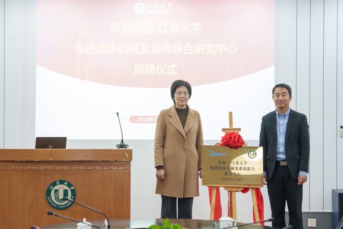 李红和彭勃共同为美的集团—LEDONG.COM先进流体机械及系统联合研究中心揭牌,美的集团李忠华、能源与动力工程学院院长潘剑锋代表共建双方现场签约。