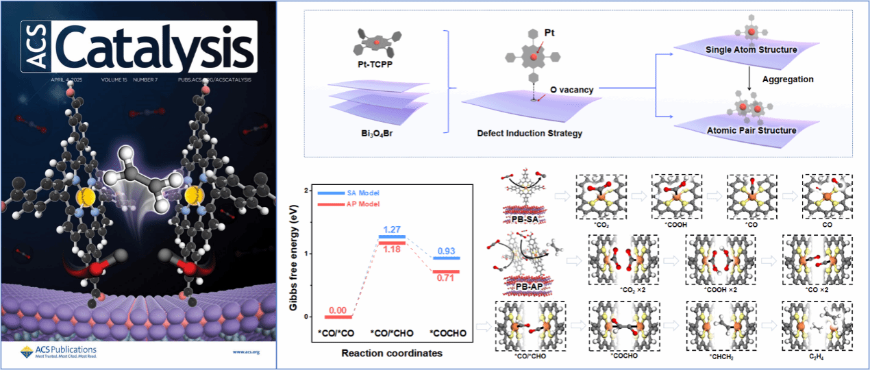 CO₂直接光催化转化为多碳产物(C2H4)是极具挑战性的国际研究前沿,符合国家“双碳”战略的重大需求,其关键在于催化剂表面CO2分子的吸附活化以及C-C偶联过程中活性位点的适配性调控。尽管单原子催化剂具有较高的原子利用效率,但其在提升C-C偶联效率上仍面临瓶颈。传统方法制备的催化剂表面活性原子对通常呈现随机间隔分布,这种无序性严重阻碍了C-C偶联过程进行。因此,通过策略工程设计优化活性位点环境,构建表面双原子对结构催化剂,是实现CO2直接光催化转化制多碳化学品(乙烯)的有效途径。