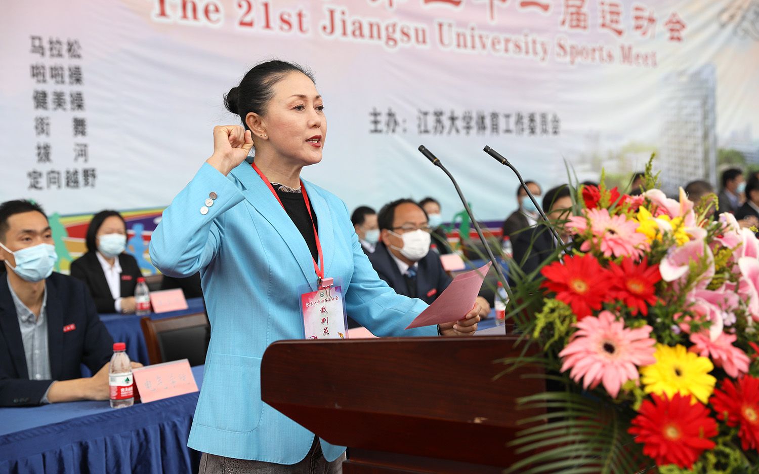 国家冰球队原队长、速度轮滑国际级裁判、轮滑球国际级裁判、体育部胡玉芹老师代表裁判员宣誓。首届全国大学生沙滩足球锦标赛冠军队员、最佳射手、管理学院郭静楠同学代表运动员宣誓。