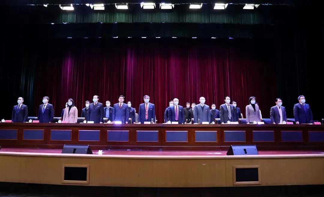 会前,全体起立,奏唱国歌。