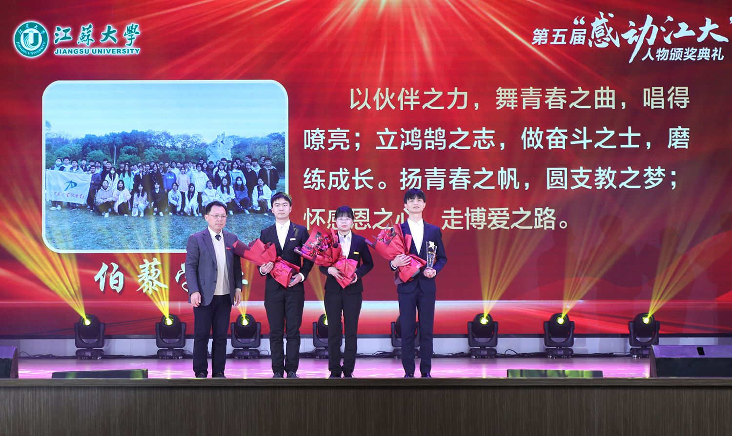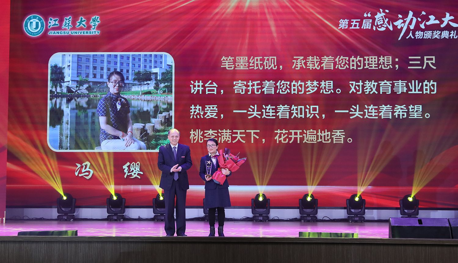 典礼上,持续深耕关心下一代园地,年至耄耋依然初心不改的退休教师金树德;在教育教学改革殿堂孜孜以求、不断创新的电路课程教学团队;热爱科学研究,在嗜盐古菌领域取得卓越成就的食生学院教师崔恒林;出生教育世家,专注教学艺术的管理学院冯缨老师;医者仁心,哪里需要就在哪里的附属医院医生张炜;以校园田径场为家,把普通学生培养成田径冠军的体育部教师景忠伟;精益求精,致力于工匠精神培养的机械工程学院教师黄娟;义务带教,以“老黄牛”和“拓荒牛”的精神投身教育事业的附属学校教师李琦;以伙伴之力舞青春之曲,以鸿鹄之志做奋斗之士的伯藜学社学子;连续11年捐资助学,总金额达55万元却始终不为人知的“两个共产党员”,10个平凡感人的故事,10段不同的经历,伴随着组委会浓缩凝练的致敬词,传递着向善向上向真向美的正能量。