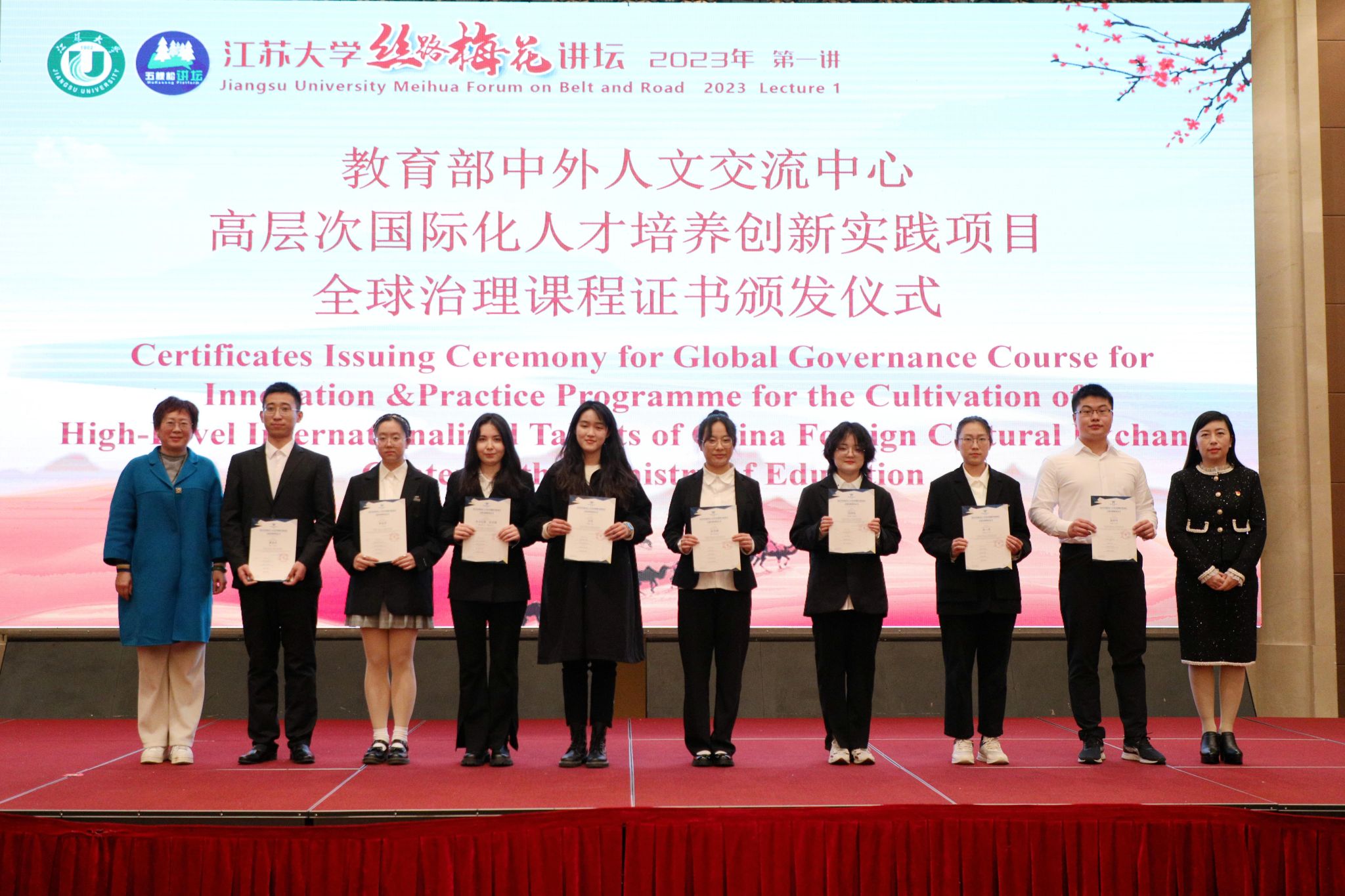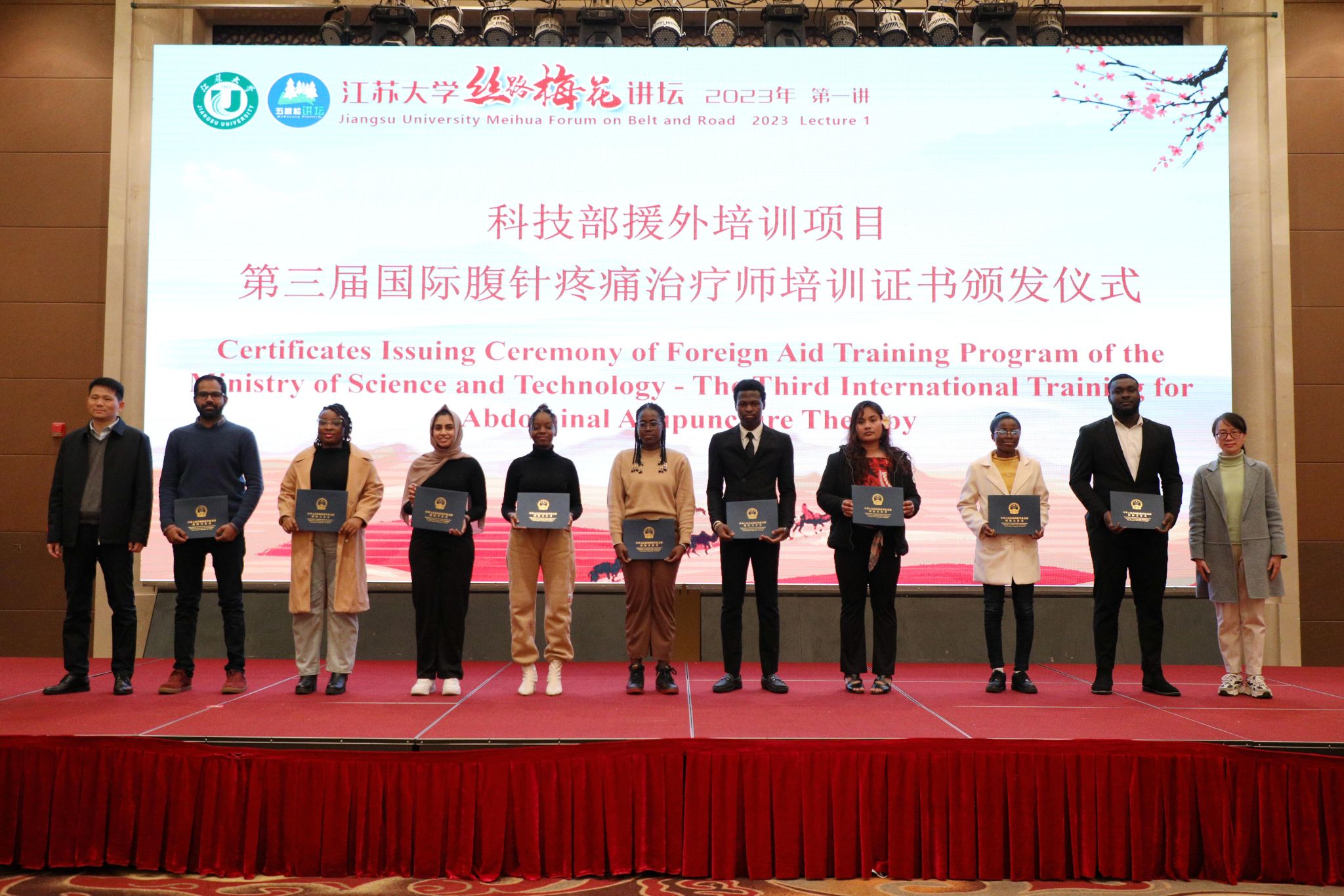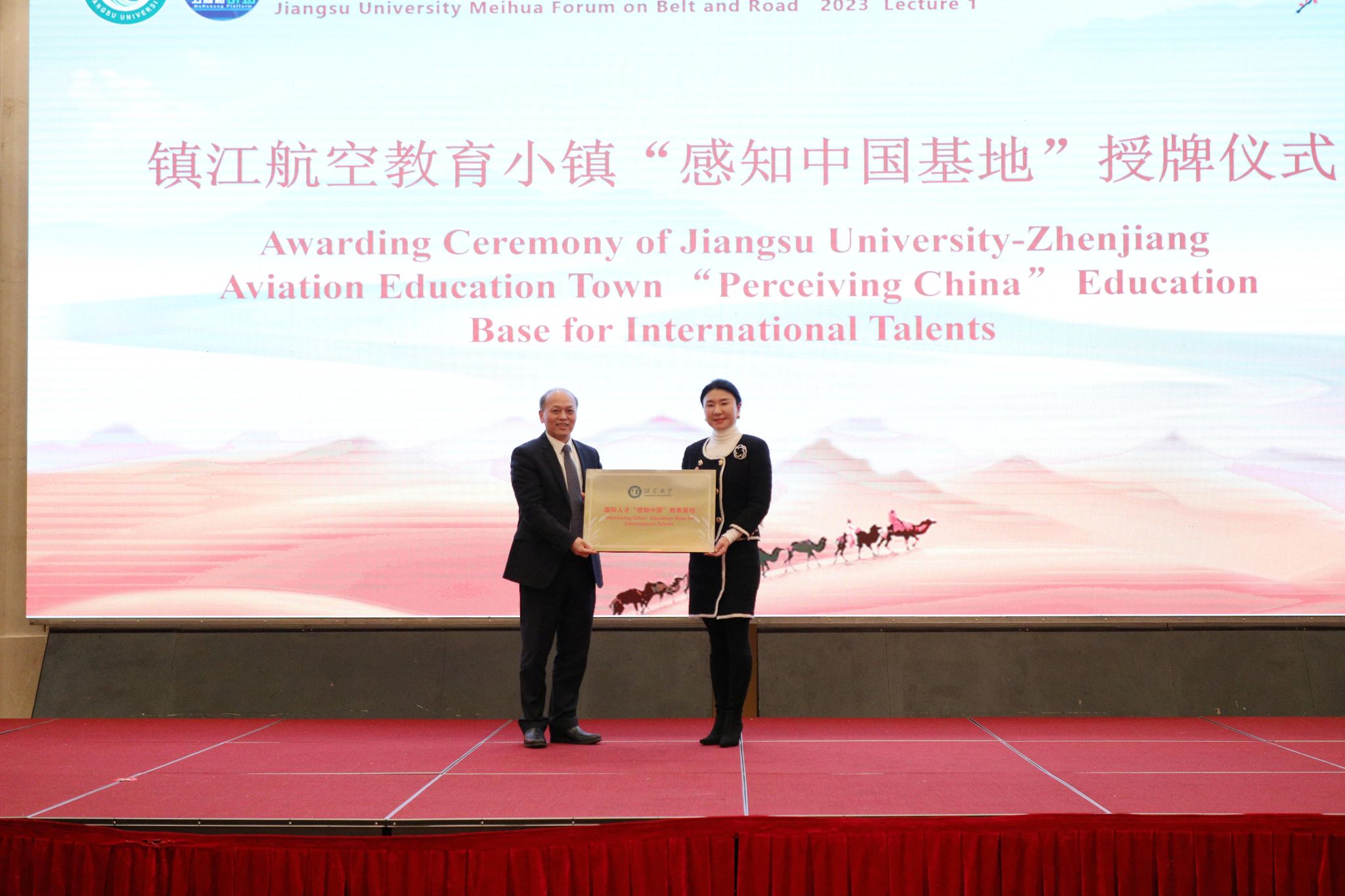 现场还举行了镇江航空教育小镇授牌“感知中国基地”仪式、教育部中外人文交流中心高层次国际化人才培养创新实践项目全球治理课程证书颁发仪式、科技部援外培训项目第三届国际腹针疼痛治疗师培训证书颁发仪式。