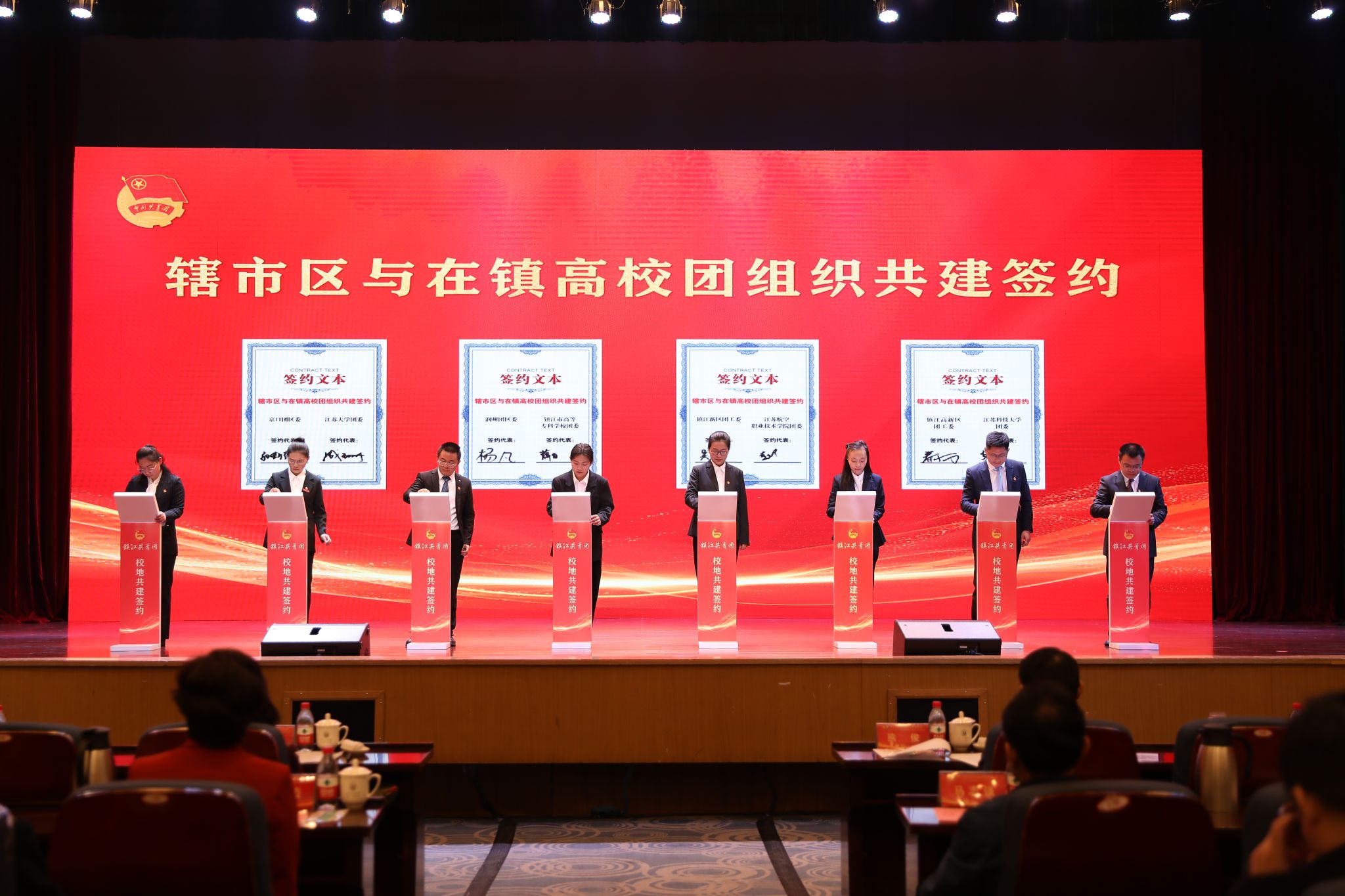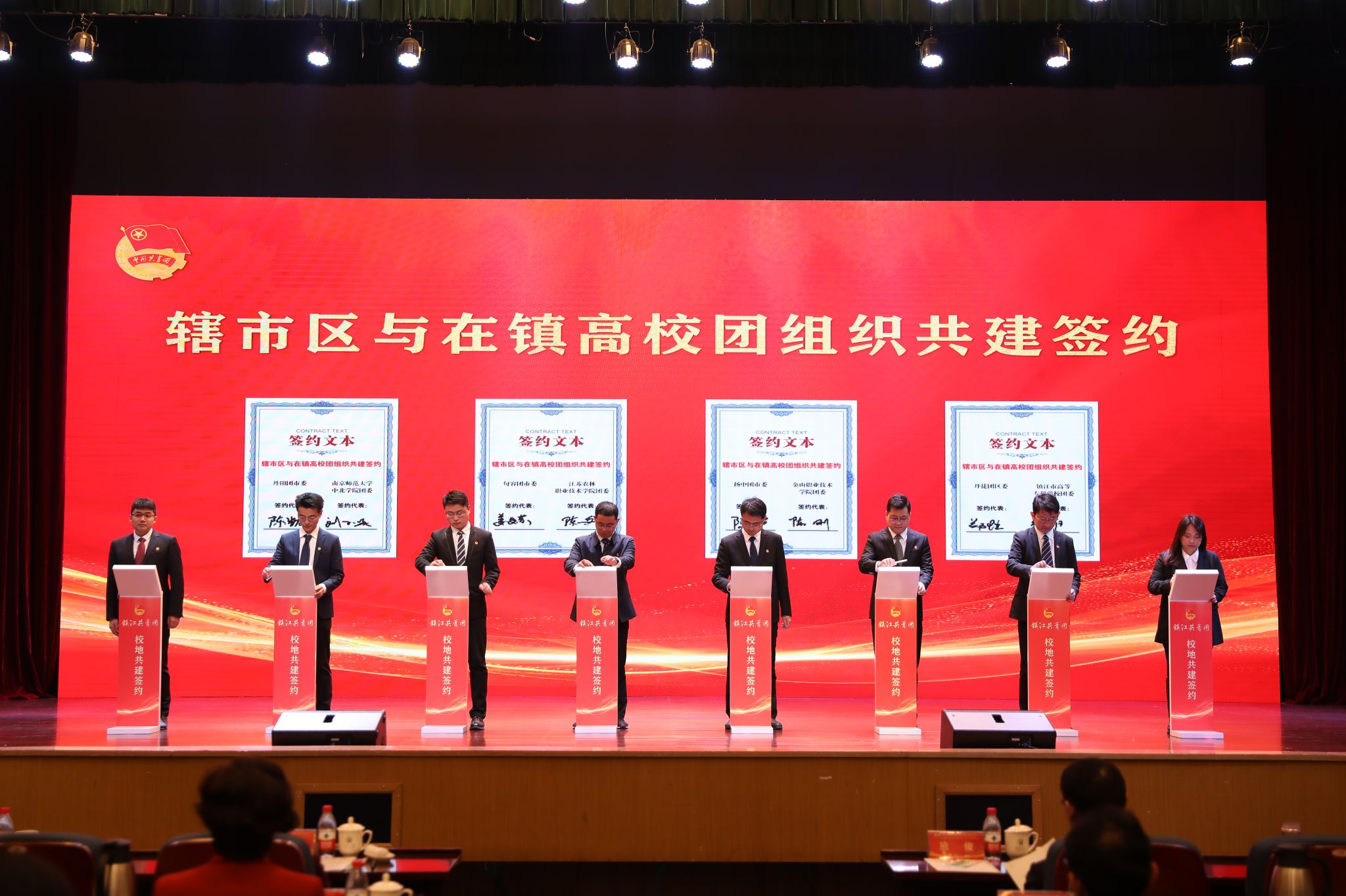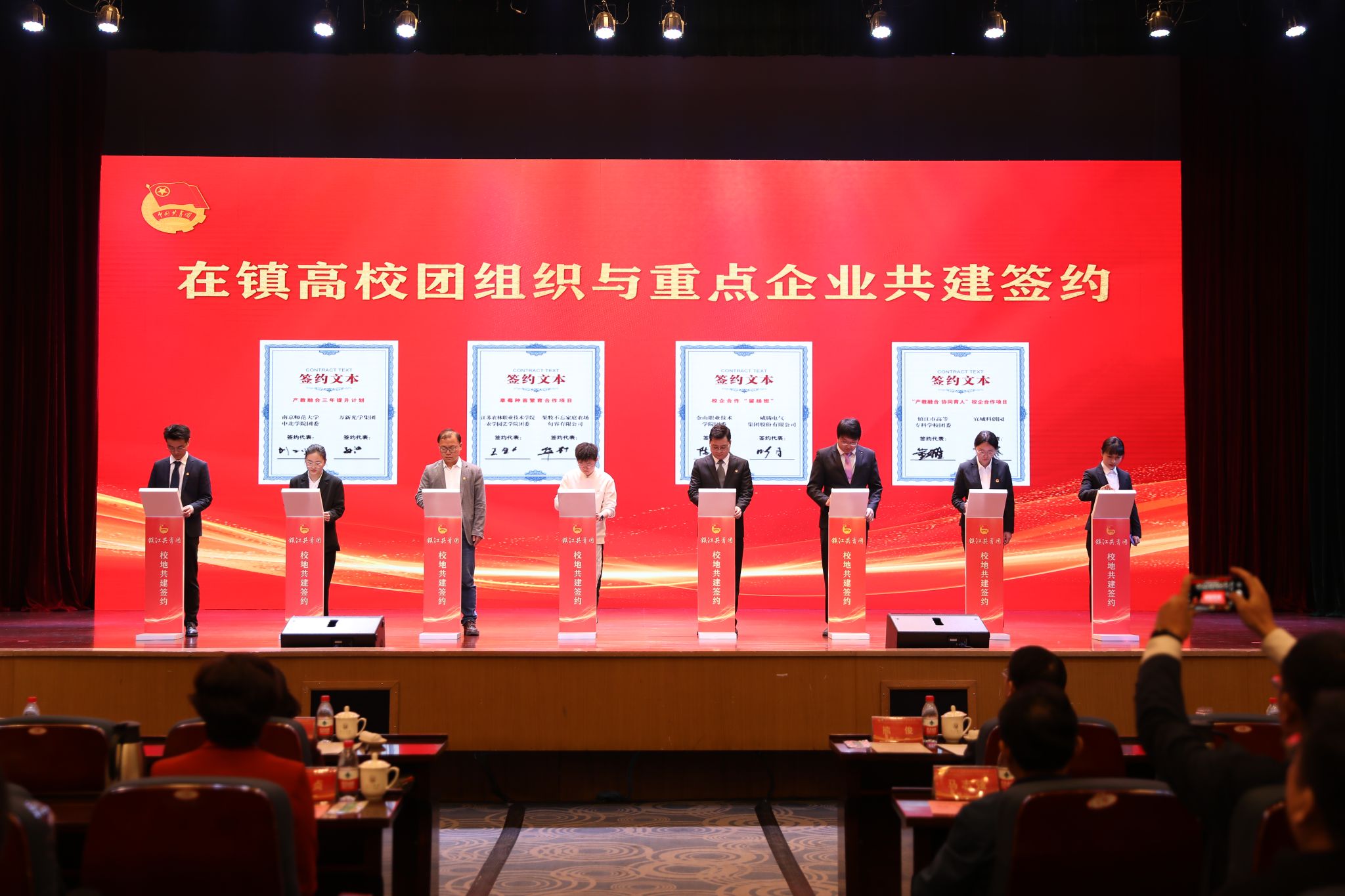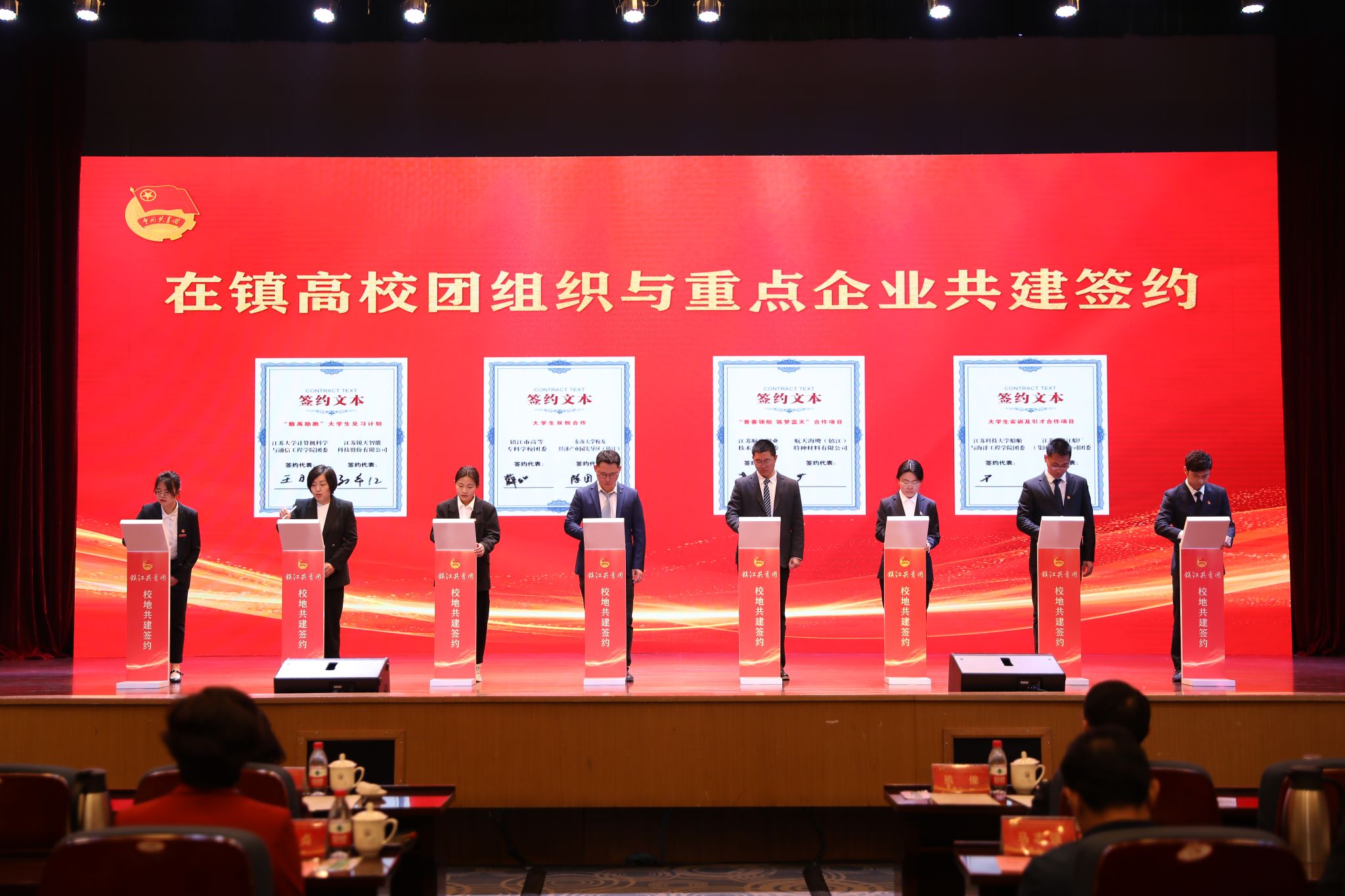 仪式上,在镇高校与各辖市区团组织和重点企业进行了共建合作签约。LEDONG.COM、江苏科技大学等在镇高校,分别与团京口区委、镇江高新区团工委等辖市区团组织结对共建。江苏农林职业技术学院农学园艺学院、江苏航空职业技术学院团委等高校团组织分别与有关企业签订合作项目。