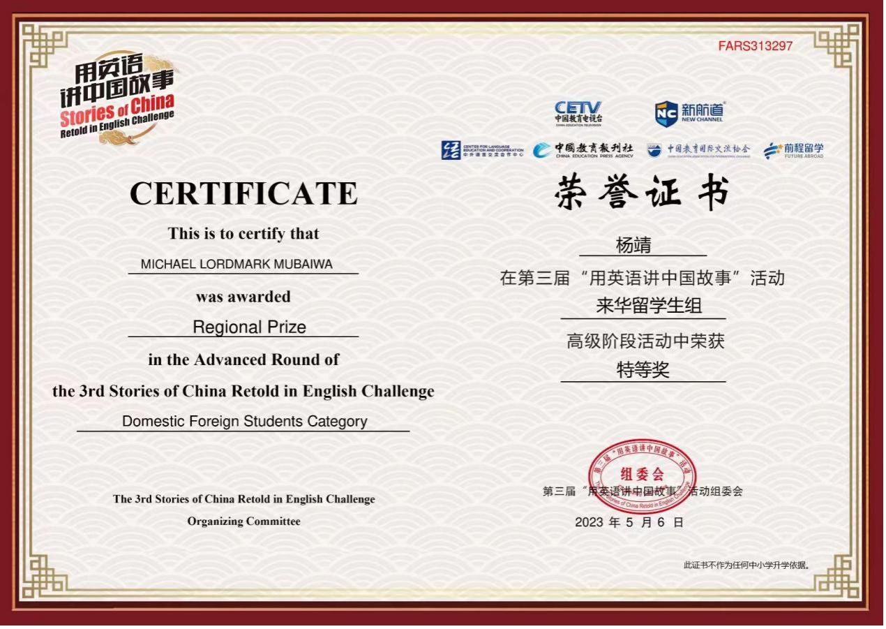 近日,我校津巴布韦籍留学生杨靖在第三届“用英语讲中国故事”活动中获全国总决赛特等奖。