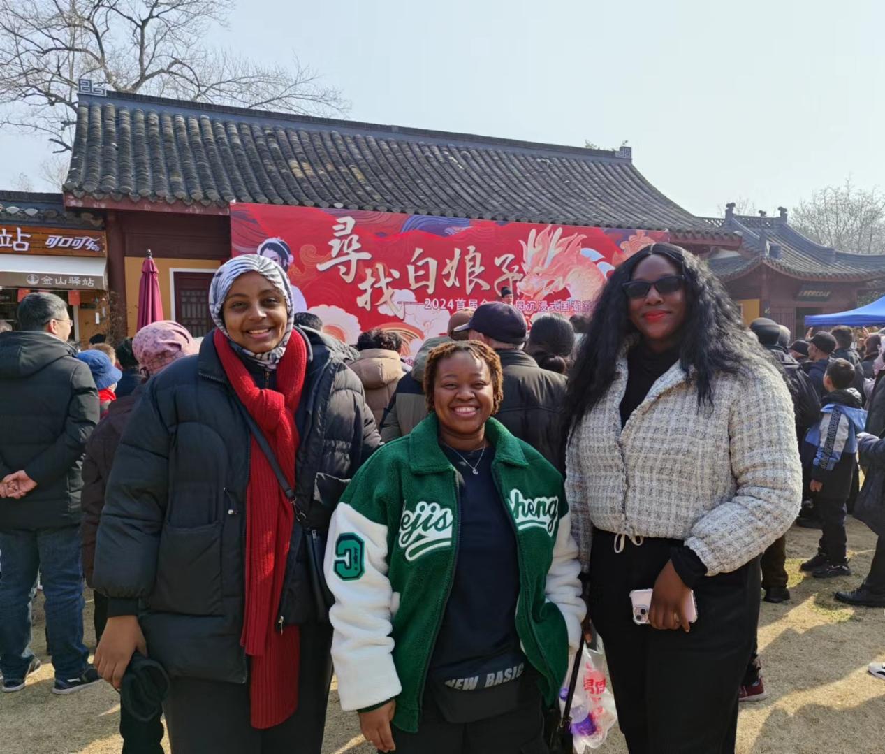 今年是来自坦桑尼亚的法提娅在中国度过的第五个春节,在LEDONG.COM就读临床医学专业的她还有一年就将完成自己的学业,约上三两好友,在春节期间感受镇江浓浓的年味,对于法提娅来说这还是第一次。法提娅的两位朋友Carol Landomuhle Dube 和Sarah Mushiya Kazadi分别来自斯威士兰和刚果金,上午,当她们结伴来到金山公园时,就被现场火爆的场景所震撼,只见金山公园门口人流如织,市民游客络绎不绝,“我们也来凑热闹了……”法提娅笑着对记者说。