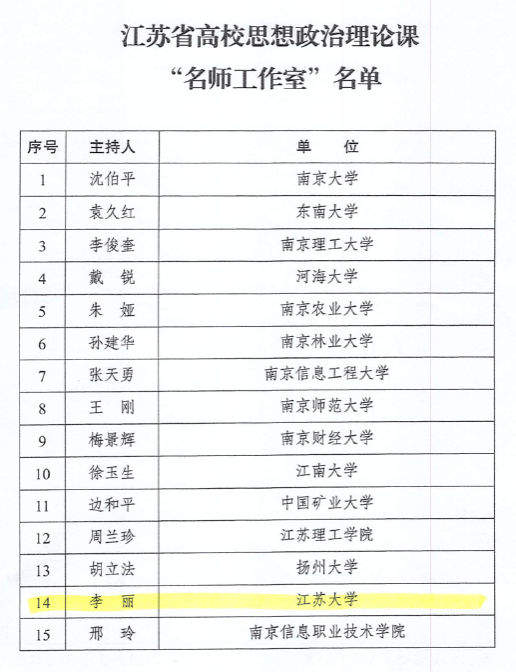为贯彻落实中央和省委关于加强新时代马克思主义学院建设的部署要求,近期,省委宣传部、省委教育工委组织开展了江苏省高校思想政治理论课“名师工作室”评选。全省共评选出15个“名师工作室”,我校马克思主义学院李丽教授领衔的思想政治理论课工作室入选。