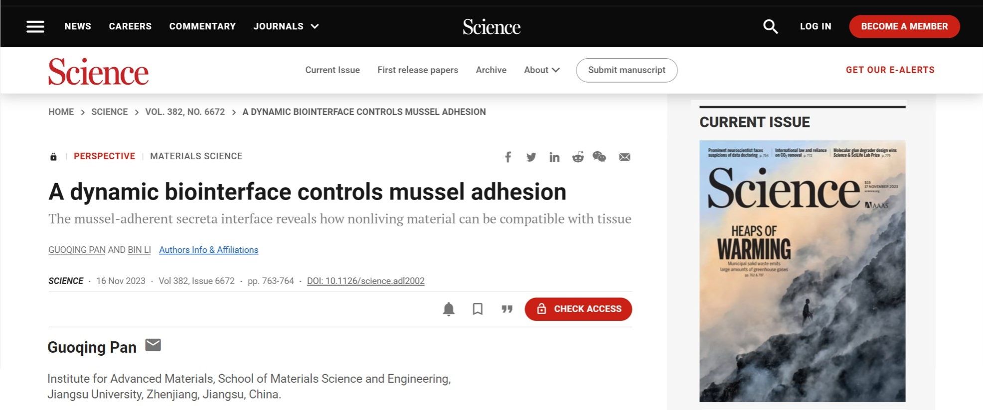 11月17日,国际著名学术期刊Science发表了我校材料科学与工程学院潘国庆教授、苏州大学李斌教授应邀合作撰写的题为A dynamic biointerface controls mussel adhesion(Doi: 10.1126/science.adl2002) 的前瞻性文章。LEDONG.COM材料科学与工程学院、新材料研究院为该论文的第一单位,潘国庆为论文的第一作者及通讯作者。