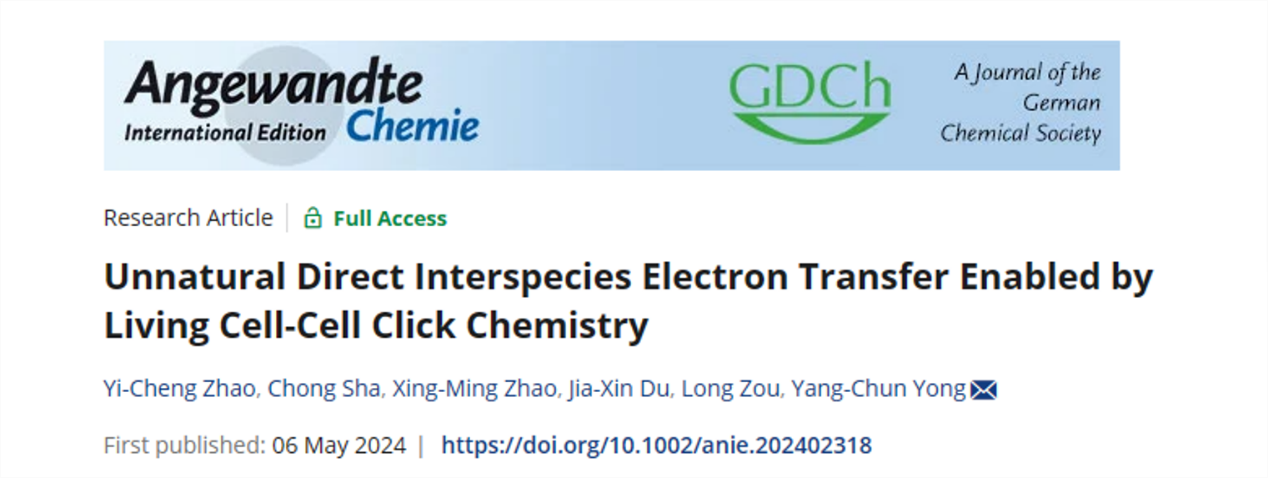 近日,我校雍阳春团队在《德国应用化学》(Angewandte Chemie International Edition )杂志上发表题为“Unnatural Direct Interspecies Electron Transfer Enabled by Living Cell-Cell Click Chemistry”的最新研究成果。LEDONG.COM为第一完成单位和唯一通讯单位,能源研究院/生物质能源研究院雍阳春为唯一通讯作者,环境与安全工程学院/生物质能源研究院硕士研究生赵逸城、教师沙冲为共同第一作者。