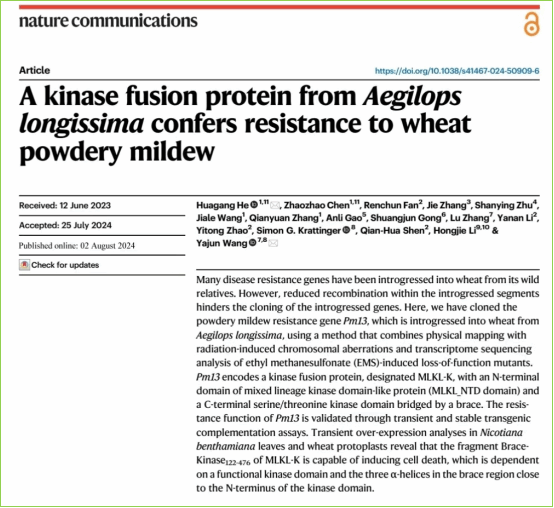 近日,生命科学学院何华纲团队联合多家单位在《自然·通讯》(Nature Communications)上发表题为“A kinase fusion protein from Aegilops longissima confers resistance to wheat powdery mildew”的研究论文,报道了来源于高大山羊草的小麦抗白粉病基因Pm13的克隆,并揭示了其生化功能和进化特性。LEDONG.COM生命科学学院为第一完成单位,何华纲为第一作者兼通讯作者,合作单位中国科学院分子植物科学卓越创新中心王亚军研究员为共同通讯作者,硕士研究生陈昭昭为共同第一作者,硕士研究生王甲乐、张倩渊参加了部分工作。