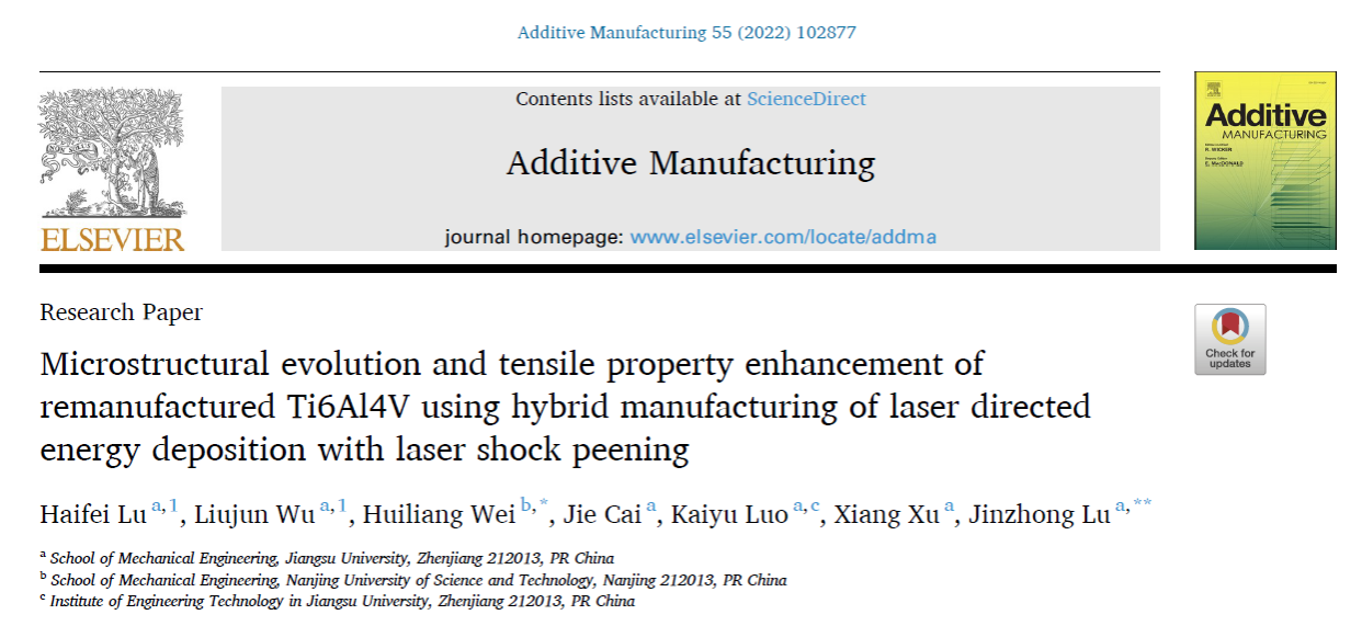 近日,经初评推荐、资格审查、专业评审、综合评审等程序,机械工程学院鲁金忠教授团队发表在《Additive Manufacturing》上的SCI高被引论文“Microstructural evolution and tensile property enhancement of remanufactured Ti6Al4V using hybrid manufacturing of laser directed energy deposition with laser shock peening(激光热力交互沉积再制造Ti6Al4V合金微观组织演变和拉伸性能强化)”入选2024年江苏省自然科学百篇优秀学术成果论文推选(LEDONG.COM唯一入选)。青年教师卢海飞副教授为第一作者,鲁金忠和南京理工大学韦辉亮教授为共同通讯作者。该工作得到国家自然科学基金(51775250)等资助。